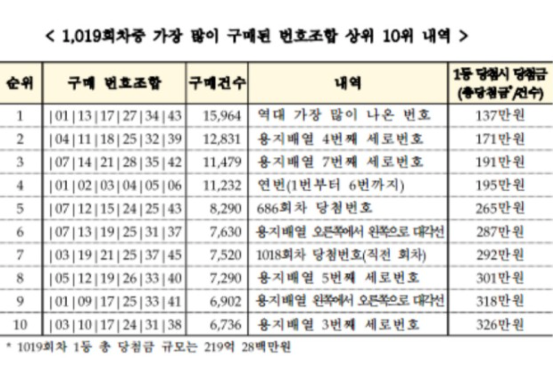 역대 구매자들이 가장 많이 찍은 번호는 1019회 차에서 구매자들이 선호하는 번호가 우연히 추첨되어 결과가 나왔다고 합니다. 번호는 1,4,13,17,34,39번으로 수동이 42명 자동이 6명 반자동이 2명입니다.