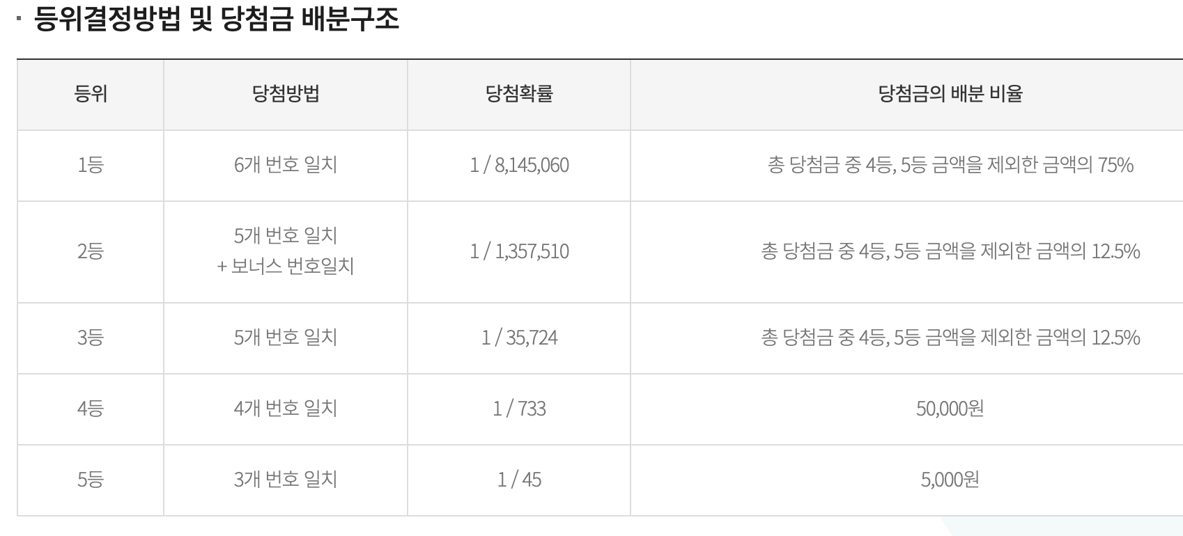 로또에 대하여 로또 6/45는 로또 단말기가 설치된 판매점에서 살 수 있고 동행복권 인터넷 홈페이지에서 구매하실 수 있습니다. 로또는 판매량에 따라 금액이 매번 달라지고 누적액과 당첨된 사람이 몇 명 인지에 따라 달리 받을 수 있습니다. 1등 당첨자가 업을 경우 당첨금은 다음 회차 1등 당첨금으로 이월됩니다. 그래서 몇 번이나 이월된 경우에는 엄청난 금액을 받는 경우도 생깁니다.