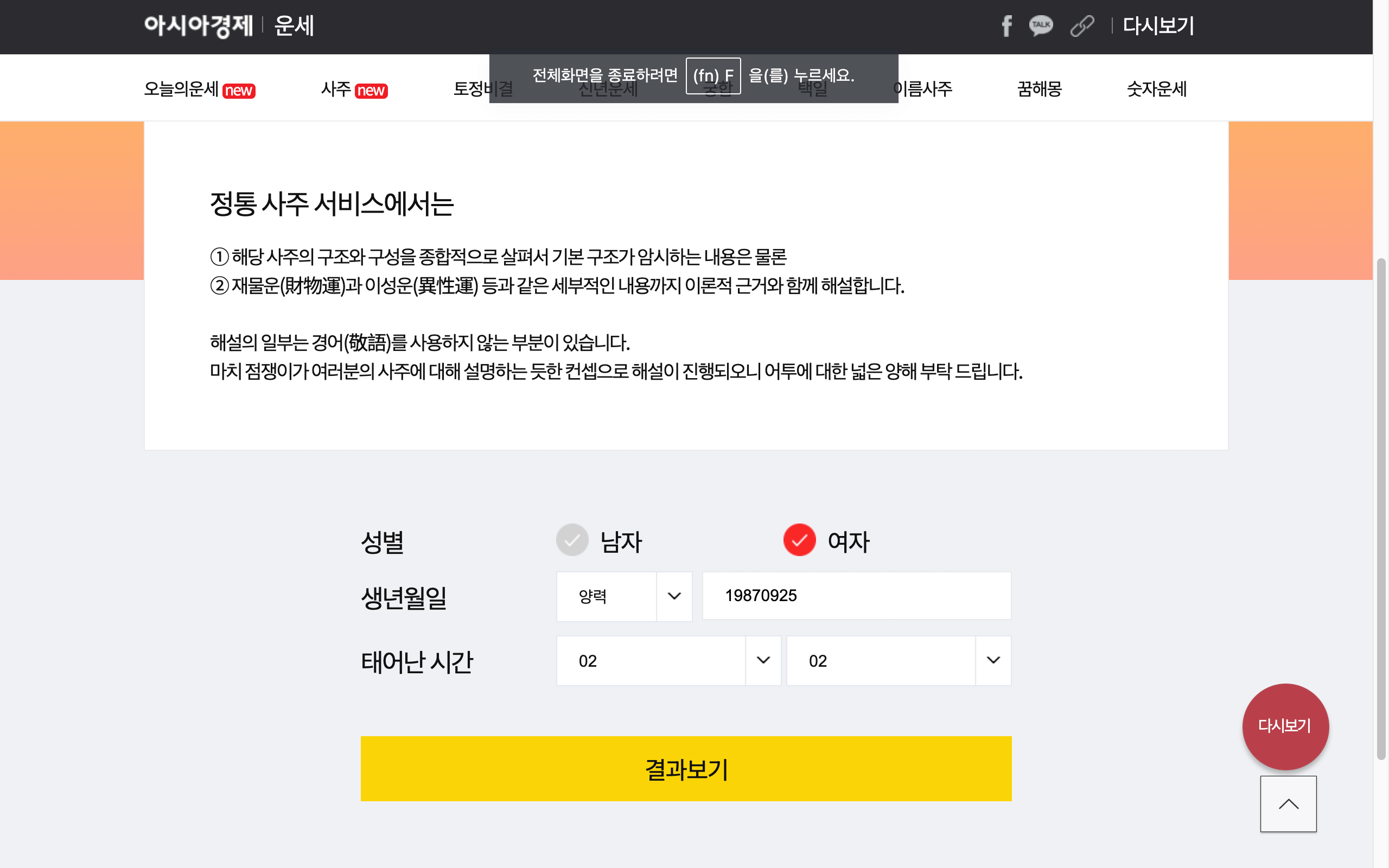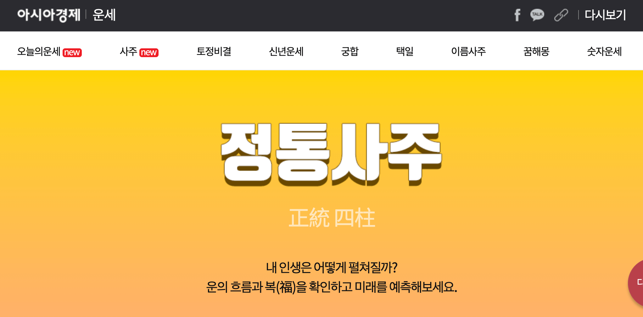 두번째는 아시아 경제에서 무료로 볼수 있는 정통사주 인데요. 아시아경제 정통사주는 사주의 구조와 구성을 종합적으로 살펴서 세부적으로 알려주는 운세 사이트로, 다른 무료 사주 사이트 보다 자세하게 운세를 풀이해준다는 데 있어서 좋을 것같습니다. 성별과 생년월일 태어난 시간까지 입력해야 점괘가 나온다는점 참고 하셨으면 좋겠습니다.