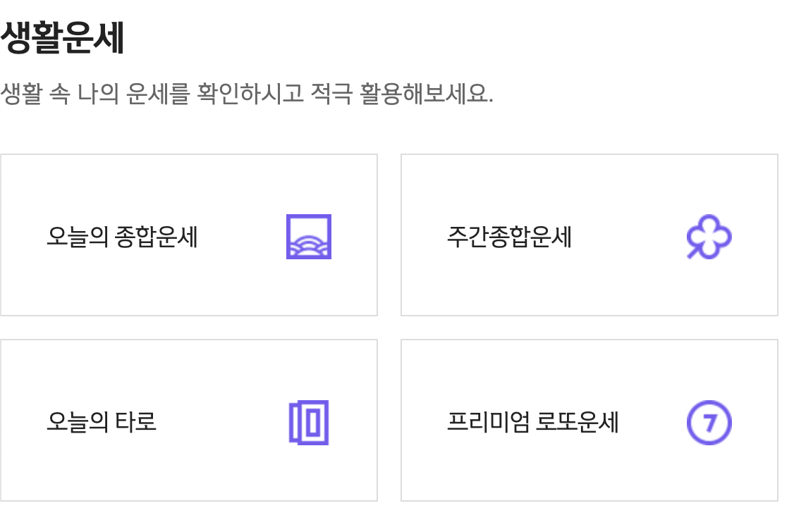 추가적으로 오늘의 종합운세와 주간 종합운세와 애정 궁합 등 다양한 방식의 운세도 볼수 있으니 매일매일 오늘하루는 어떤지 별도로 사이트를 저장해 놓고 확인하시는 것도 좋을 것같습니다.